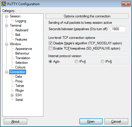 Unter „Connection“ kann man ein Intervall (in Sekunden) angeben, in dem keep-alive packets an den Server gesendet werden. Wenn das Intervall kürzer ist als das Server-Timeout gehören nervige PuTTY Neuverbindungen der Vergangenheit an.