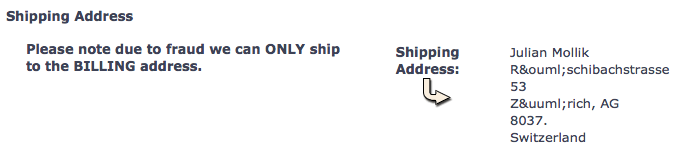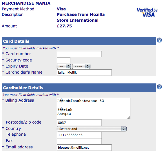 Der Kauf hat also nicht geklappt. Meine Vermutung ist, dass (siehe Screenshot 1) die Rechnungsadresse (von RBS WorldPay) auf Grund der Umlautproblematik nicht 100% ident mit der Lieferadresse (des Mozilla Store International) ist. Möglicherweise liegt es auch daran, dass die Röschibachstrasse auf der Rechnungsadresse meiner Visa-Karte mit OE und nicht mit Ö geschrieben ist und dass diese Divergenz zu einem Fehler im Anti-Fraud System des Shops führt.