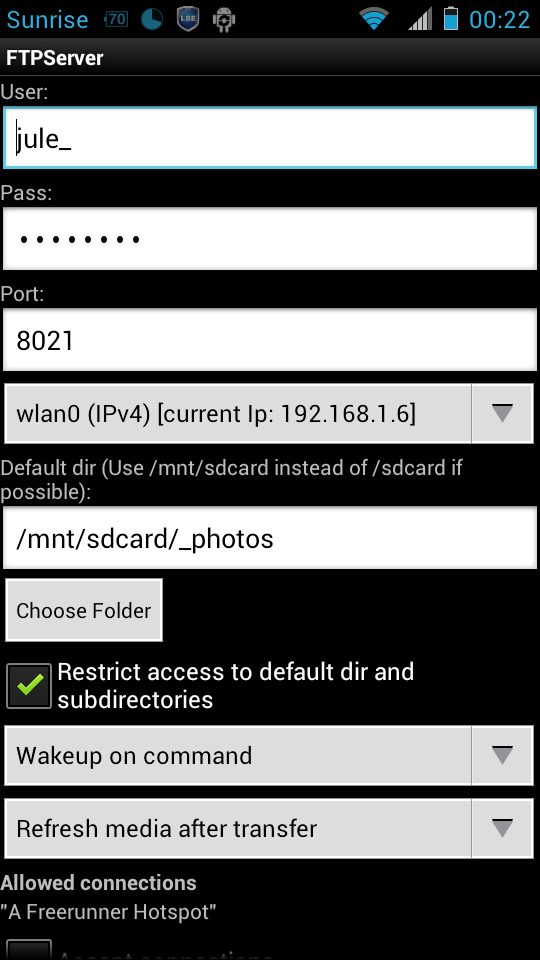 FTPServer erstellt – wie der Name schon verrät – einen FTP Server auf dem Android Gerät. Mit jedem FTP Client Programm (ich verwende den im Dateimanager ForkLift eingebauten Client) kann man sich nach Eingabe der am Mobiltelefon angegebenen Daten mit dem Telefon verbinden und Daten in die eingestellten Ordner hochladen. Als zusätzliche Sicherheitsmassnahme kann man das WLAN Netz einschränken, in dem eine Verbindung erlaubt ist.