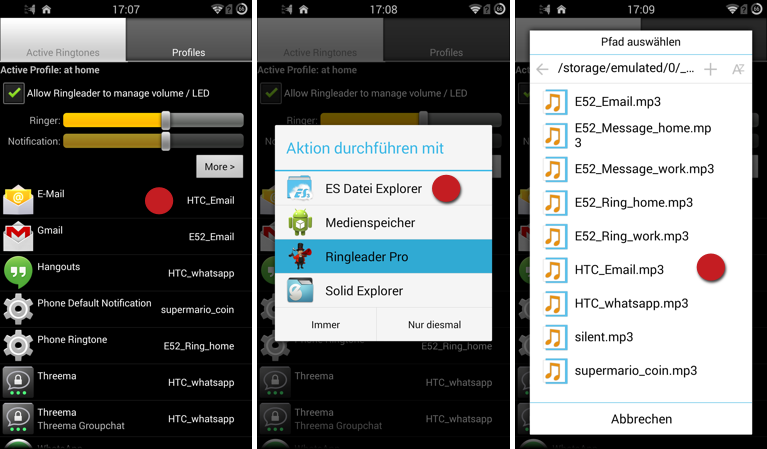 Unterhalb dieser Einstellungen werden alle Apps gelistet, in denen man zuvor Ringleader als Proxy eingestellt hat. Durch einen Tab auf den entsprechenden Eintrag (1) kann man den im aktuellen Profil gewünschten Ton (3) auswählen. Bei diesem Durchlauf ist es nicht mehr nötig im „Aktion durchführen mit“ Fenster den Ton über Ringleader auszuwählen (2). Ein direkter Klick auf – zum Beispiel – ES Datei Explorer genügt.